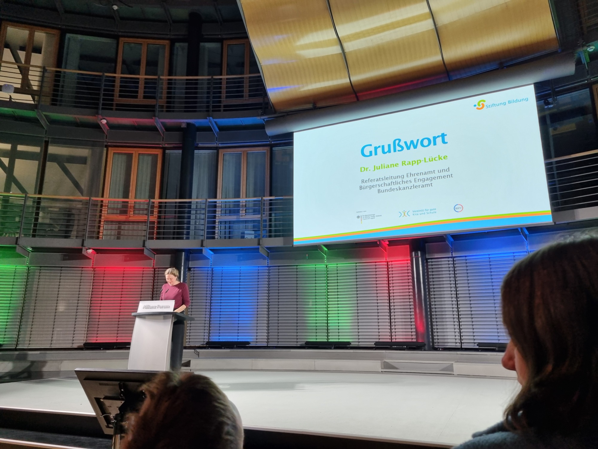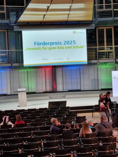 Am 28.11.2025 fand in Berlin (im Allianzforum - in unmittelbarer Nähe des Brandenburger Tors) dieVerleihung des Förderpreises 2025 „Verein(t) für gute Kita und Schule“ der Stiftung Bildung statt. Ausgezeichnet wurden vorbildliche Projekte, die Bildung in Deutschland aktiv und nachhaltig gestalten. Die Preisverleihung würdigte das Engagement von Menschen, die Bildung vor Ort und bundesweit stärken. Durch die Preisverleihung hat uns das Moderatorinnen-Team, Gloria und Saraphina Boateng abwechslungsreich und spannend geführt. Jedes der 27 Projekte erhielt einen Pokal sowie eine Urkunde. Beides kann in der Grundschule Frickenhofen bewundert werden!