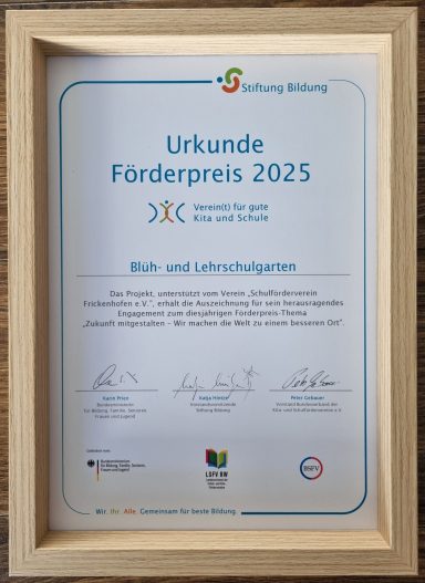 Mit unserem Projekt „Blüh- und Lehrschulgarten“ haben wir uns zusammen mit unserem Schulförderverein Frickenhofen e.V. über den Bundesverband der Kita- und Schulfördervereine e.V. (BSFV) beworben und sind nun aus vielen Projekten für den Bundesentscheid ausgewählt worden.